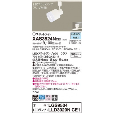 パナソニック 配線ダクト取付型 LED(昼白色) スポットライト プラスチックセードタイプ・ビーム角24度・集光タイプ LEDフラットランプ交換型 XAS3524NCE1