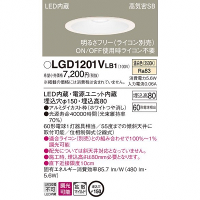 パナソニック LEDダウンライト 埋込穴φ150 温白色 浅型8H 高気密SB形 拡散 調光 LGD1201VLB1